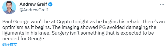 此前快船官方宣布乔治右膝扭伤,将因伤休战2-3周;考虑到常规赛接近尾声,名记woj表示乔治预计常规赛报销;乔治预计缺席常规赛剩余比赛,但好消息是他免遭韧带撕裂的重伤,无需手术,有望在季后赛首轮复出。Andrew Greif还表示乔治能多快恢复取决于机动性和他的感觉,他在首轮系列赛回归可能显得过于乐观。