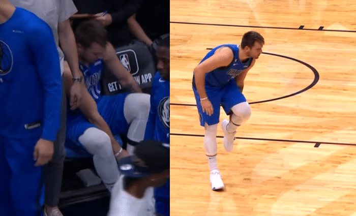 东契奇首节两次摔倒,一次是面对丹尼尔斯斯摔倒,手肘好像蹭了一下,捂着手肘有些痛苦;东契奇单挑海斯再次摔倒;镜头还拍到东契奇站在场上以及替补席捂着跟腱,所幸身体无碍。