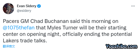 特纳确定留守步行者继续担任首发中锋 正式结束与湖人的交易谈判