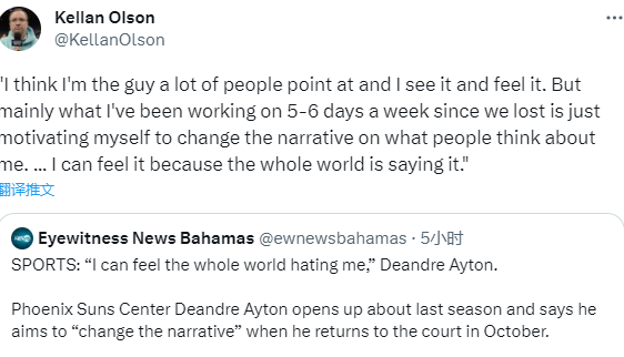谈到上赛季时,艾顿表示:我能感觉到全世界都在恨我,我认为我是那个被人们指指点点的人,我看到了这一点,也感受到了这一点。但自从我们输球以来,我每周工作5-6天,主要就是为了激励自己去改变人们对我的看法。