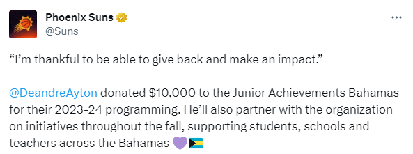 艾顿正式向巴哈马青少年组织捐赠 10000 美元,用于他们的2023-24年计划。他还将在整个秋季与该组织合作开展多项举措,为巴哈马各地的学生、学校和教师提供支持。