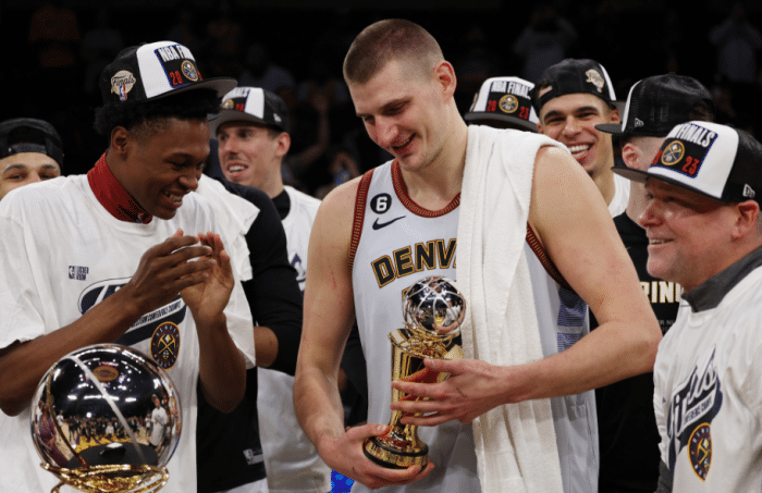 约基奇捧起西决MVP后,全队都为他高呼MVP以及按着约基奇的头疯狂庆祝;离场时,约基奇抱着MVP奖杯和两个哥哥拥抱庆祝,马龙离场时,约基奇的两个哥哥直接抱起掘金主帅。