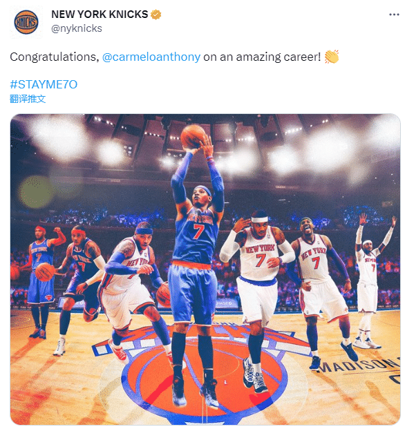 纽约尼克斯发推祝贺:“恭喜,你有一个很出色的职业生涯。”安东尼曾为尼克斯效力7个赛季,出战412场比赛,场均贡献24.7分7篮板3.2助攻。
