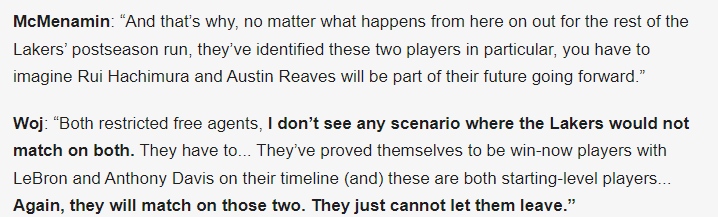 名记Woj则表示:这两名球员都将在休赛期都是受限制自由球员,湖人会匹配他们两个人的合同报价,他们已经证明了自己能帮助AD与詹姆斯获得胜利,而且他们都是首发级别的球员……湖人不会让他们离开的。