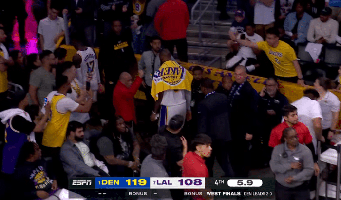 赛后中国记者周玲安现场采访小波特,后者表示掘金众将希望在下一场终结系列赛;与此同时,周玲安透露在现场,湖人球迷沮丧狂嘘詹姆斯。
