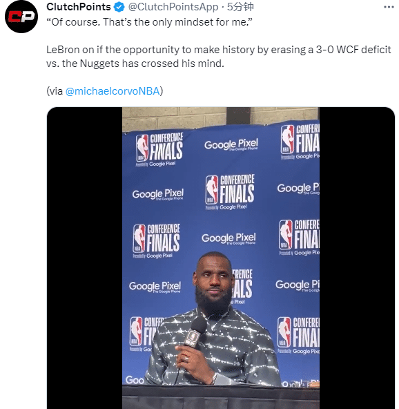 当被问及球队是否有机会在0-3落后情况下翻盘创造历史时,詹姆斯表示:当然,这是我现在唯一的想法。