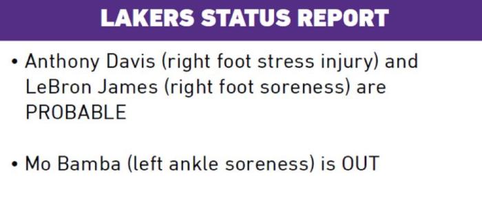 来源:JRS直播05-20 09:48JRS直播讯05月20日,湖人官方公布西决G3伤病报告,詹姆斯(右脚酸痛)和浓眉(右脚伤病)继续被列为大概率出战,班巴(左脚踝酸痛)继续缺席比赛;詹姆斯左脚踝伤势无碍,预计继续带伤出战;湖人夺冠概率仅有10.3%,哈姆G3会再次变阵吗?