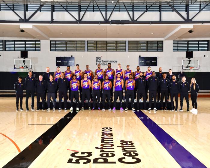 在太阳全队大合影上,太阳教练组成员站在前排两侧,蒙蒂-威廉姆斯站在萨宾-李身旁,沙梅特、佩恩、保罗、布克和奥科吉都站在第一排,其中保罗面带笑容站在中间C位。
