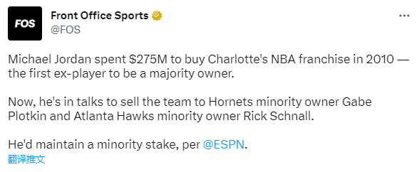 woj还表示出售黄蜂队的大部分股份将标志着乔丹13年老板生涯将结束。乔丹在2006年成为山猫(现黄蜂)的小老板,于2010年成为球队大老板。