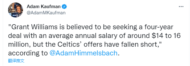 来源:JRS直播10-14 20:52JRS直播10月14日,据凯尔特人记者Adam Kaufaman报道,格兰特-威廉姆斯想要一份最高4年6400万美元的续约合同,但凯尔特人给的报价低于格威的预期;双方都有意达成4年合同,但续约金额暂未谈拢,而且谈判陷入僵局。