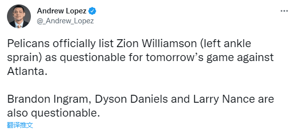 今天鹈鹕官方把锡安的伤情更新为左脚踝扭伤,进入每日观察名单,目前来看,锡安的脚踝伤势应该不严重;此前鹈鹕主帅威利-格林表示锡安不会缺席很长时间,队医经过二次检查确定伤情并不严重,出于预防考虑才让他提前退出比赛。
