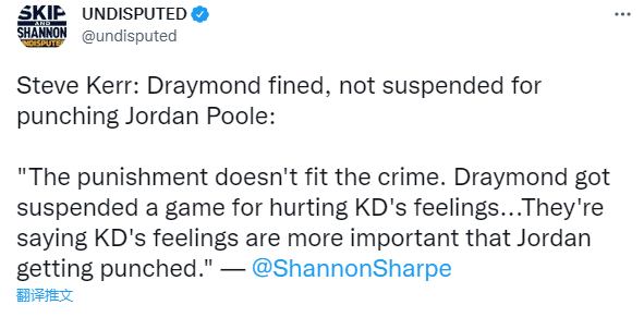 名嘴Shannon Sharpe在节目中表示:我不认为这样的处罚与他所犯的错误匹配,追梦因为在场边喷杜兰特,伤害了KD的感情而被禁赛一场,所以换句话说,凯文-杜兰特的感情比普尔的脸被打更重要。