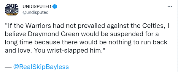 另一名嘴Skip Bayless则表示:如果勇士没有战胜凯尔特人夺得总冠军,我相信德雷蒙德-格林将被禁赛很长一段时间,因为没有什么可以回头去爱的了,毕竟你的手打了他一拳。