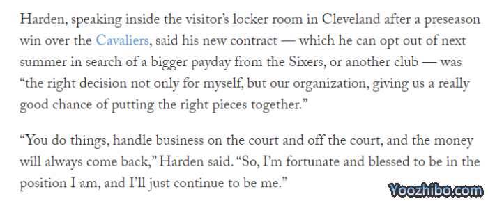 据TA名记Joe Vardon透露,76人双杀骑士赛后,哈登在更衣室谈到他的新合同,表示:这不仅对我自己,对我们的球队都是正确的决定,我们现在得到了一个很好的机会把正确的东西组合在一起;只要你做好场上和场下的每一件事,钱总会回来的,所以,我很幸运,能站在自己的位置上,我会继续做我自己。