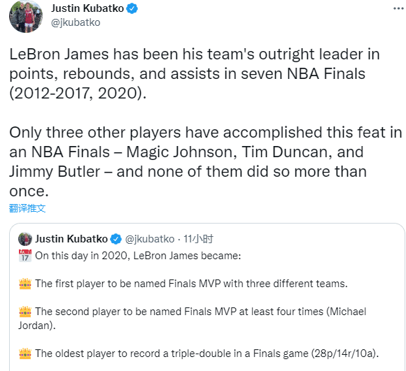 19年生涯至今,詹姆斯10次带队杀进总决赛,据统计,詹姆斯曾在7届总决赛中得分、篮板和助攻都领跑全队,如此纪录历史唯一,史上只有魔术师约翰逊、石佛邓肯和吉米-巴特勒曾完成如此壮举,但他们都是只做到过一次。