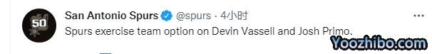 马刺官方宣布,球队正式执行后卫德文-瓦塞尔合同第四年球队选项(2023-24赛季),以及约书亚-普里莫合同第三年(2023-24赛季)球队选项。