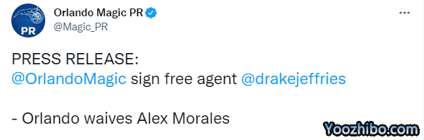 魔术官方宣布,球队签下后卫德雷克-杰弗里斯,并裁掉了亚历克斯-莫拉莱斯。