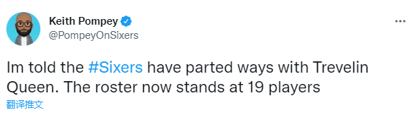 据76人随队记者Keith Pompey报道,球队已经裁掉了火箭旧将特雷韦林-奎因,球队目前大名单上剩19人;今年休赛期,76人以2年365万美元签下了奎因,但该合同这赛季仅有33万美元受保障,2023-24赛季无保障。