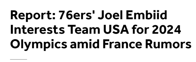 美国男篮和法国男篮都想竞争这位全明星中锋,但恩比德本人并没有正式作出决定。“我现在只想保持健康,赢下冠军,”恩比德目前只把专注力放在新赛季。