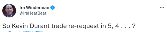 对于杜兰特疯狂砍分,篮网却被热火打爆,美记者Ira Winderman发推调侃:凯文-杜兰特再次申请离队倒计时?