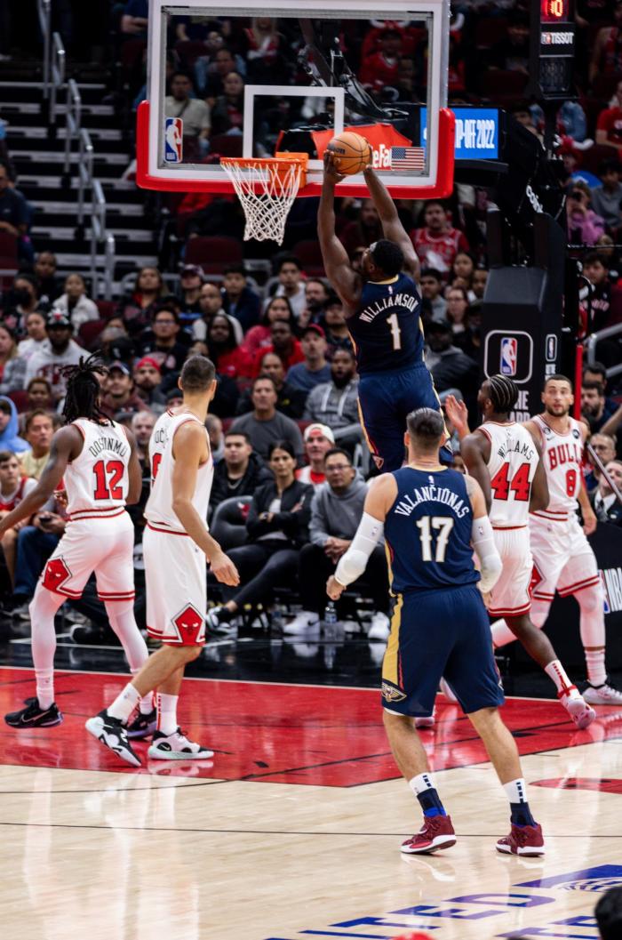 第二节,锡安上来险些抢断反击,但逼迫公牛24秒进攻违例,随后锡安强突上篮得分,助攻麦科勒姆命中底角三分;9分06秒,鹈鹕琼斯有些不适,所幸身体无碍。