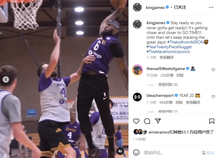 詹姆斯还在Ins上配文写道:做好准备,这样你就永远不需要准备!!离开启第20年的时间越来越近了!在此之前,让我们继续努力训练。