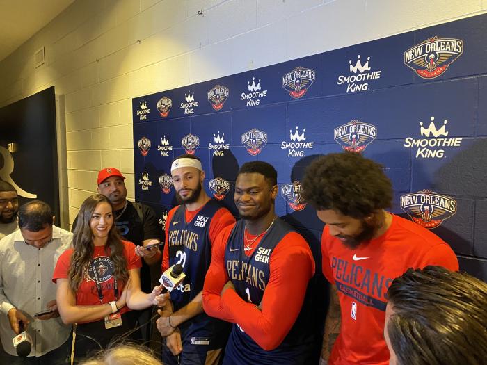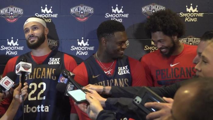 值得一提的是,接受采访时锡安和英格拉姆笑着对视,莺歌坏笑表情和邋遢造型太抢镜。