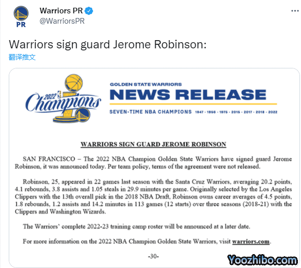 勇士官宣再签一人:19人冲冠大名单出炉 仅剩最后一席仍等伊戈达拉