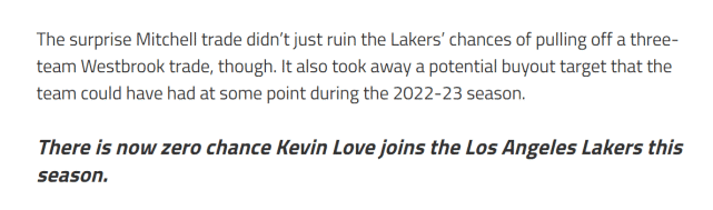 第二个亏,在于湖人也失去了新赛季某个时候签下乐福的可能。在得到米切尔前,乐福原本是骑士潜在的买断人选。骑士想要让莫布里打更多时间,买断乐福,省一些钱的同时让他签约更有竞争力的球队是有道理的。