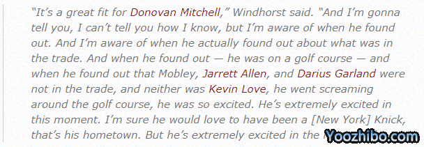 “米切尔非常适合骑士。我要跟你们说一件事,我不会告诉你们我怎么知道的。那就是当米切尔得知自己被交易时他在打高尔夫球”文霍斯特说道,“当他得知莫布里、加兰、阿伦还有乐福都没有被放到交易中时,他绕着高尔夫球场大喊大叫,非常激动。我知道他很想去家乡球队尼克斯,但得知交易(前往骑士)的那一瞬间,他还是超级激动。”