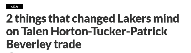 斯坦恩还报道称,湖人7月份探讨潜在交易时,曾反对用霍顿-塔克换贝弗利的想法,因为当时湖人希望新赛季的球队更年轻、更快,可是6周后,至少有两件事改变了他们的计划。这也是霍顿-塔克被拿来换黑贝的原因。