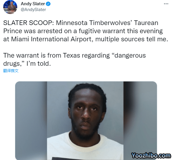 来源:JRS直播08-26 12:24JRS直播08月26日讯 ,森林狼悍将惹上事了,据美记者Andy Slater报道,森林狼球员托里恩-普林斯因在得克萨斯州携带危险药物被通缉,当地警方下达通缉令,最终普林斯在迈阿密国际机场被逮捕,并且入狱被关押,当地时间星期四下午6点被关押的。