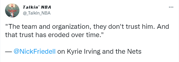 名记Nick Firedell表示:我被告知,篮网已经不信任欧文。随着时间的推移,这种信任已经被侵蚀。篮网认为,就像球队总经理马克斯在赛季后接受的采访那样,要重新建立球队文化,建立起属于他们的东西。但是在两周之前,蔡崇信又发推称欧文是最好球员之一,篮网的社媒也发了类似的内容,和赛季结束后的发言相比,他们对欧文的态度发生了180度的转变。