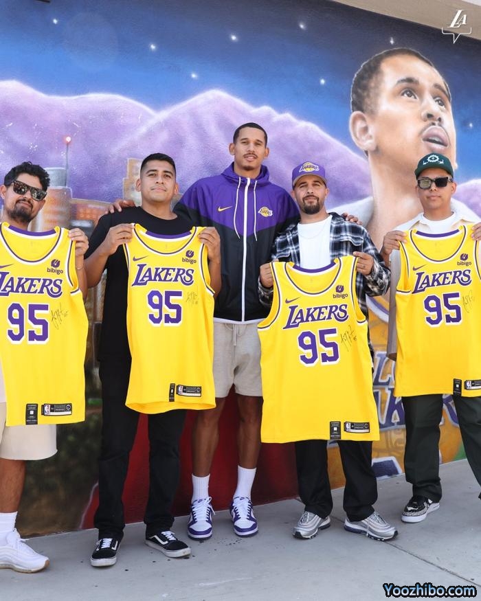 湖人新援安德森在洛杉矶拥有一处巨幅壁画,壁画中安德森身穿湖人95号球衣;今日安德森身穿紫金配色的湖人外套来到现场,不仅与壁画合影,而且与球迷合影并且给球迷们签名。