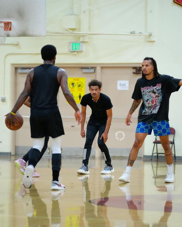 特雷-杨还和欧文一起打野球,同样是在洛杉矶,吹杨和科尔-安东尼一队,欧文和猛龙新星巴恩斯一队,NBA球员一起打野球,比赛十分精彩。