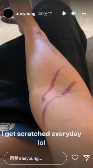 特雷-杨还在INS动态上晒出了一张自己今天打球时手臂被抓伤的照片,两道长长的血痕,并配文写道:我每天都被抓伤。呵呵!