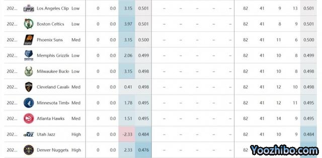1. 掘金、2.爵士、3.老鹰、4. 森林狼、5.骑士、6.雄鹿、7.灰熊、8.太阳、9.凯尔特人、10.快船、11.猛龙、12.热火、13.76人、14.独行侠、15.湖人、16.鹈鹕、17.勇士、18.篮网、19.黄蜂、20.公牛、21.开拓者、22.国王、23.奇才、24.步行者、25.尼克斯、26.活塞、27.魔术、28.火箭、29.雷霆、30.马刺。