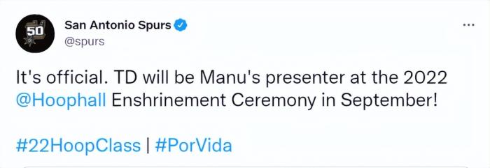马刺官方也公布了这一消息,并晒出了邓肯和吉诺比利的多张温馨合影。马刺曾经在GDP组合的率领下,打造了一个非常成功的时代,邓肯、吉诺比利和帕克成为马刺王朝最美好的回忆。还有球迷晒出了总决赛上搞笑的一幕,邓肯伸手想和吉诺比利击掌,妖刀没看着,邓肯自己勾了一下缓解尴尬。