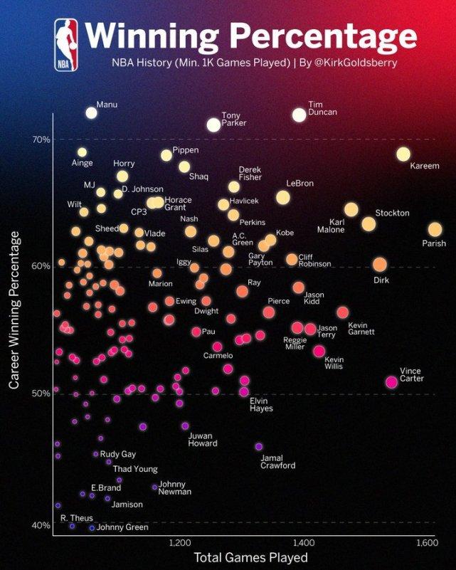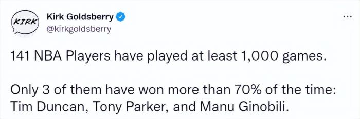 数据专家Kirk Goldsberry晒出了GDP组合的一项逆天赢球数据。NBA历史上,一共有141名球员至少打过1000场比赛,而这141名球员中,只有3人的胜率至少达到70%。他们分别是邓肯、帕克和吉诺比利!