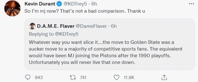 一个网友再次攻击杜兰特加盟勇士的举动。“他去勇士,就相当于乔丹在199年季后赛后加入活塞……”杜兰特回击道:“所以,我现在又成了MJ(迈克尔-乔丹)了?这不是一个糟糕的比较,谢谢你。”