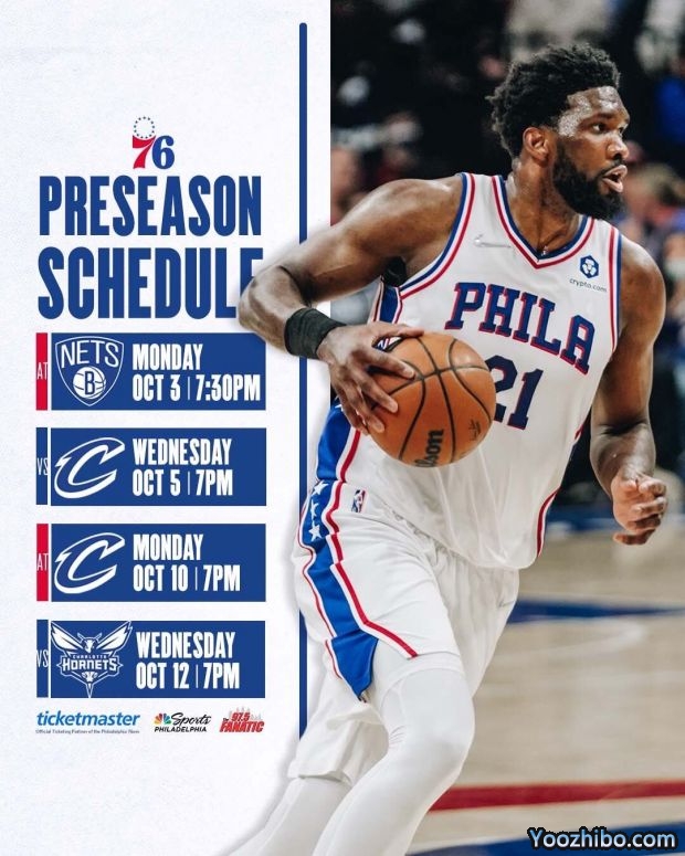 JRS直播讯 北京时间8月15日,费城76人公布了2022-23赛季季前赛赛程,一共有4场比赛,其中首战客场挑战布鲁克林篮网。