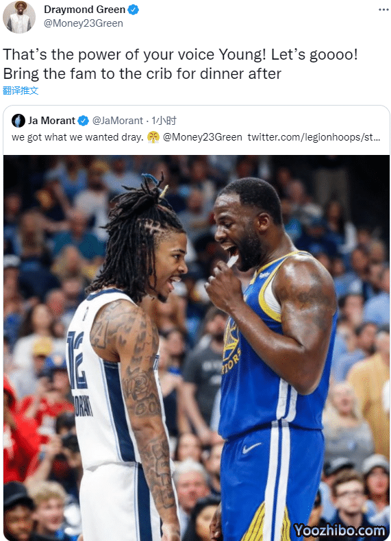 灰熊当家球星莫兰特转发灰熊年终大战勇士的报道,晒出与追梦格林的同框赛场照,并且发推写道:我们得到了我们想要的东西@格林;之后格林回复:这就是你的声音的力量,加油年轻人,赛后记得带你的家人去吃晚餐。