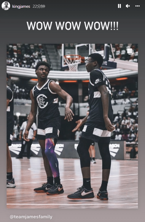 今天詹姆斯的两个儿子17岁布朗尼和15岁布莱斯首次联手出战,詹姆斯激动发推写道:兄弟们,我真的是第一次在比赛中看到布朗尼和布莱斯一起在场上!!这太疯狂了!!我真的很激动!!哇哦。