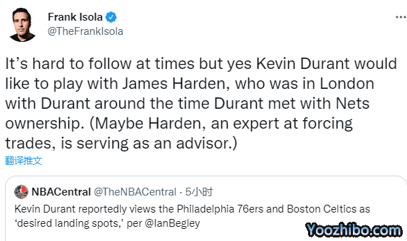 espn名记Frank Isola转发杜兰特想去76人和绿军的报道,发推写道:有时候这很难理解,但杜兰特愿意和哈登一起打球;当杜兰特与篮网老板会面时,哈登也在伦敦(或许作为强制交易方面的专家,哈登担任了顾问的角色)。