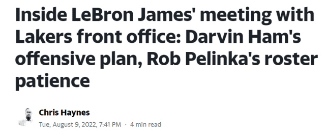 来源:JRS直播08-10 19:48JRS直播08月10日讯 湖人球星詹姆斯和他的经纪人里奇-保罗,在上周与湖人总经理佩林卡和主教练达文-哈姆进行会面。詹姆斯已经有资格和湖人提前续签2年9710万美元的合同。北京时间8月10日,名记克里斯-海耶斯揭秘了这次会面的具体内容——