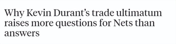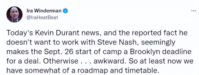 名记Woj此前也透露,杜兰特希望欧文在篮网得到一份长期合同,但这没有发生,在欧文没有找到合适的签换交易之后,他与篮网的沟通就停止了。记者Ira Winderman表示:杜兰特交易的最后期限是9月26日训练营开始前,否则队内的情况会很尴尬。