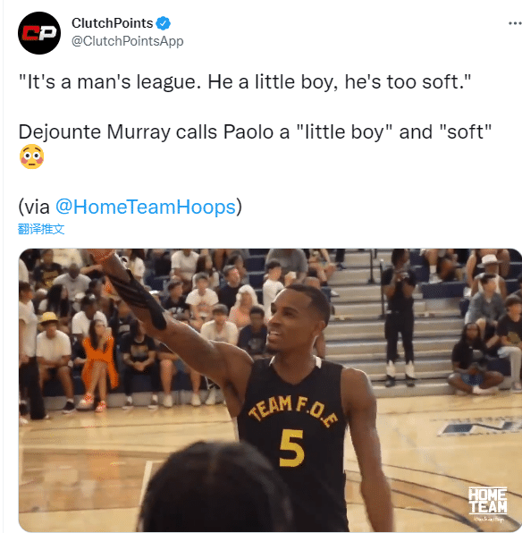 来源:JRS直播08-08 20:49JRS直播08月08日讯 ,老鹰新援穆雷羞辱新科状元班凯罗引发巨大热议,穆雷一套连招晃晕班凯罗后自抛自扣,并且冲着班凯罗喷垃圾话以及扔球砸向班凯罗;穆雷怒骂状元脏话曝光,据美媒ClutchPoints报道,穆雷下场时冲着班凯罗说:这是男人的联盟,他只是小男孩,他太软了。