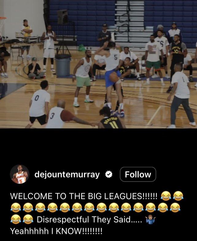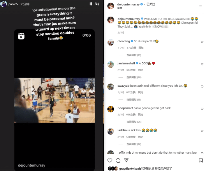 穆雷在社交媒体上晒出羞辱班凯罗的这一幕,配文写道:欢迎来到NBA(多个笑哭表情),他们说这是不尊重人,无所谓,没错,我知道。