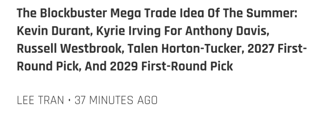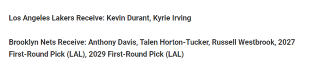 具体交易方案是湖人送出浓眉、霍顿-塔克、威少、2027年首轮签和2029年首轮签,得到篮网的杜兰特和欧文。
