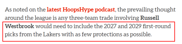 Michael Scotto 还表示,联盟中普遍的共识是任何涉及威少的三方交易,都需要湖人送出2027年首轮和2029年首轮,而且要尽可能少保护,这一点是湖人一直犹豫的地方。